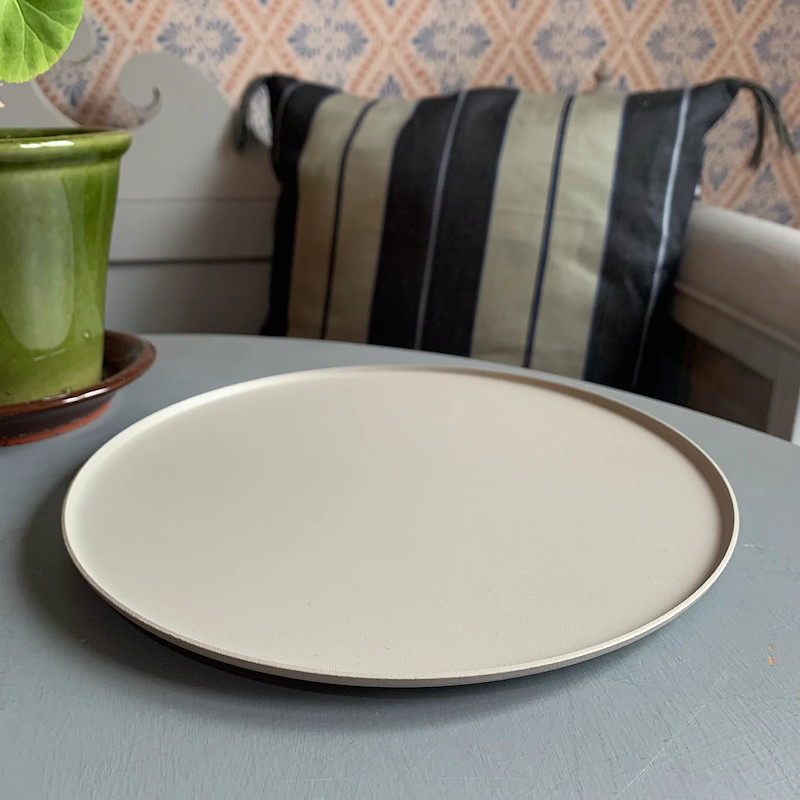 Schlichtes schwedisches Design: Runder Teller aus Metall mit drei Filzfüssen an der Unterseite und einem flachen Rand.